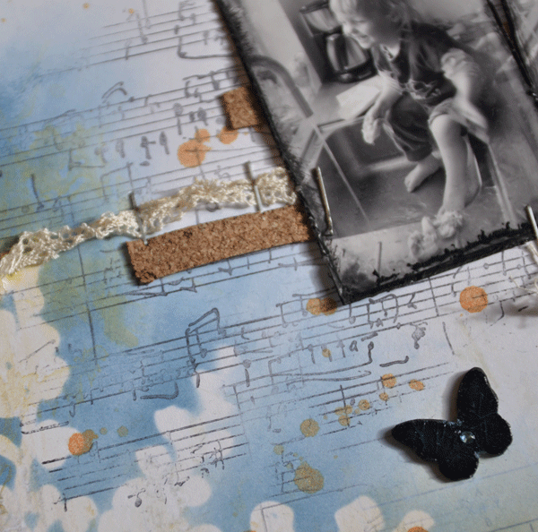 Flere steder har jeg lavet sorte splats med en sort mist, og den samme mist har jeg brugt til at farve denne pil- Den lille